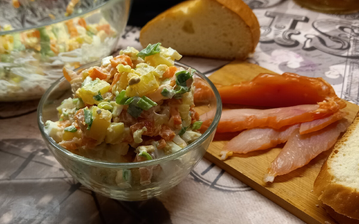 Итак, сегодня есть поесть некая вариация на тему поднадоевшего Оливье. Подаем к столу и наслаждаемся всей семьей!