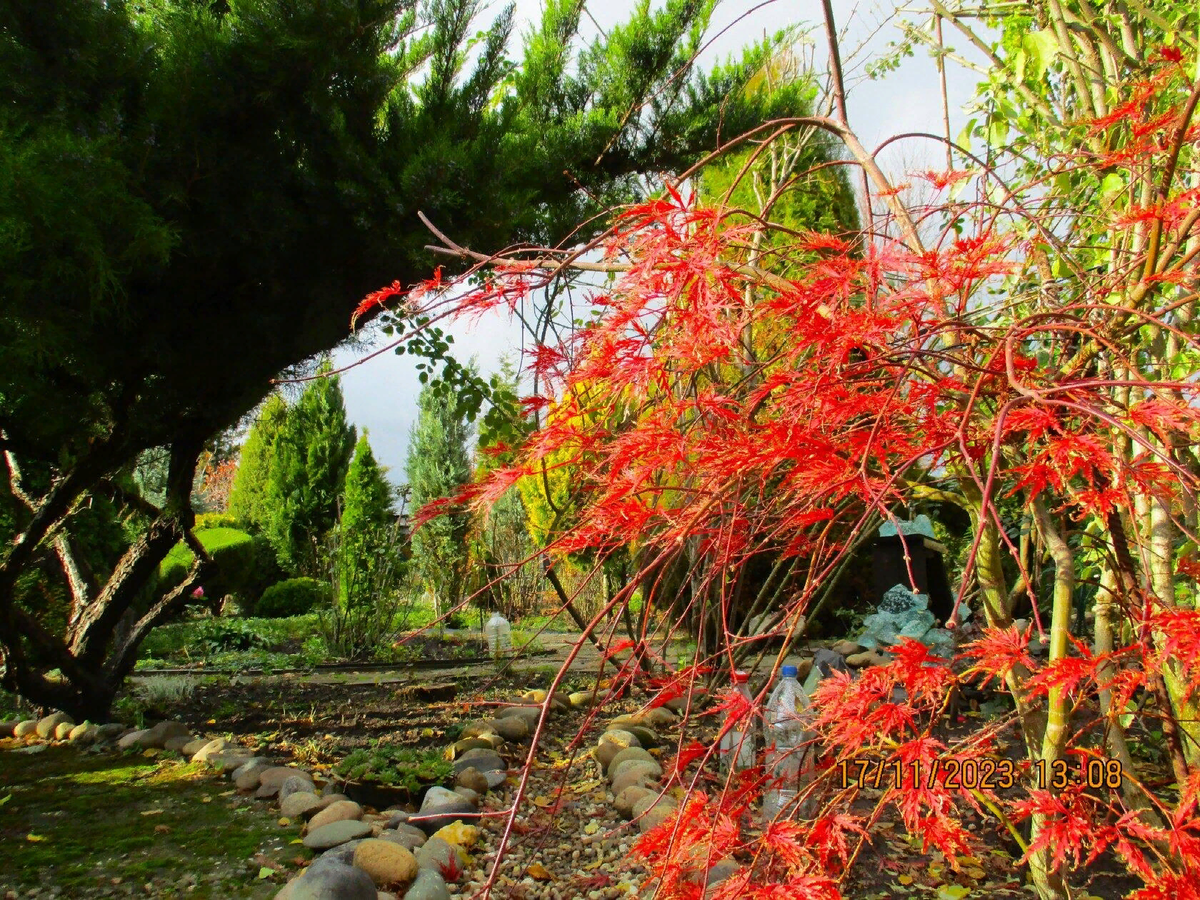 Японский клён "Эмеральд Лэйс". У него такие же ажурные , кружевные листья. Только летом они были зелёными. А клён "Гарнет" весь сезон с красными листьями разных оттенков с ранней весны и почти до зимы.