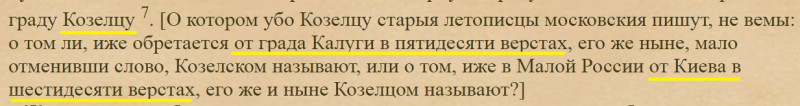 В общем Батый развернул войска от Новгорода и пошел в Козелц. Современные историки однозначно и безоговорочно Козелц отождествляют с городом Козельск в Калужской области, это примерно в 200 км от Москвы на юго-запад. Однако Лызлов не был так уверен, и писал, что где находится город Козелц доподлинно не известно. Он давал две версии. Первая - это тот самый Козельск юго-западнее Москвы, вторая версия - это современный поселок Козелец ровно посредине между Черниговом и Киевом.