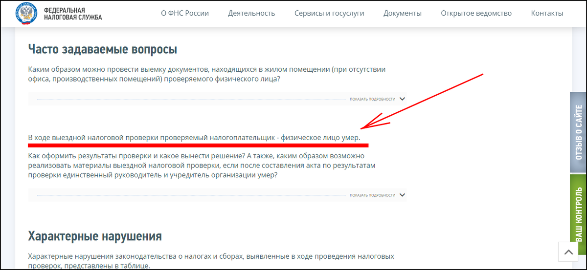 Чёрный юмор — юмор с примесью цинизма, комический эффект которого состоит в насмешках над смертью, насилием, болезнями… Ученые-психологи считают, что вероятно, черный юмор нужен людям, он дает психологическую разрядку, позволяет расслабиться, в трудных ситуациях снимает напряжение. У Налоговой службы есть официальный сайт. Откройте сайт и зайдите в раздел «Процедура проведения выездных налоговых проверок». https://www.nalog.gov.ru/rn77/taxation/reference_work/reglament_vnp Сайт хороший, придраться не к чему. Информация изложена простым доступным языком. Есть ссылки на статьи Закона. Приложены формы документов. Картинок маловато. Теперь, самое интересное. Если прокрутить страницу до самого низа, Вы найдёте раздел «Часто задаваемые вопросы». Вопросов всего два. Второй вопрос: в ходе выездной налоговой проверки проверяемый налогоплательщик - физическое лицо умер Представляете? Это самый часто задаваемый вопрос про выездные налоговые проверки! Что это? Юмор от фискалов, типа «не надо довод