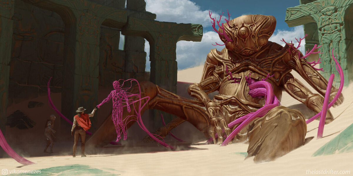 Вико Менесес - профессиональный иллюстратор из Бразилии. Его основная работа состоит в том, что он создаёт арты и концепты для студий, занимающихся разработкой игр. Среди его работодателей, например, Fantasy Flight Games - американская компания, создающая ролевые настольные игры и Space Ape Games, занимающаяся разработкой мобильных игр. В интернете же Вико популярен благодаря фантастическим картинам, созданных с помощью "цифровой живописи". Самый известным на сегодня проектом бразильца является серия работ под общим названием The Last Drifter. Художник даёт крайне мало информации о мире и сюжете (мы даже имени героини не знаем), но при этом за всем кроется что-то масштабное. Неизвестная девушка в красном пончо и доспехах путешествует на необычном мотоцикле по пустынной планете в компании робота . Они регулярно попадают в переделки и жизнь их явна полна опасностей. Вот несколько примеров картин из этой серии: Есть в этом всём и что-то от вестерна и от Дюны... Очень интригующе! Надеюсь,