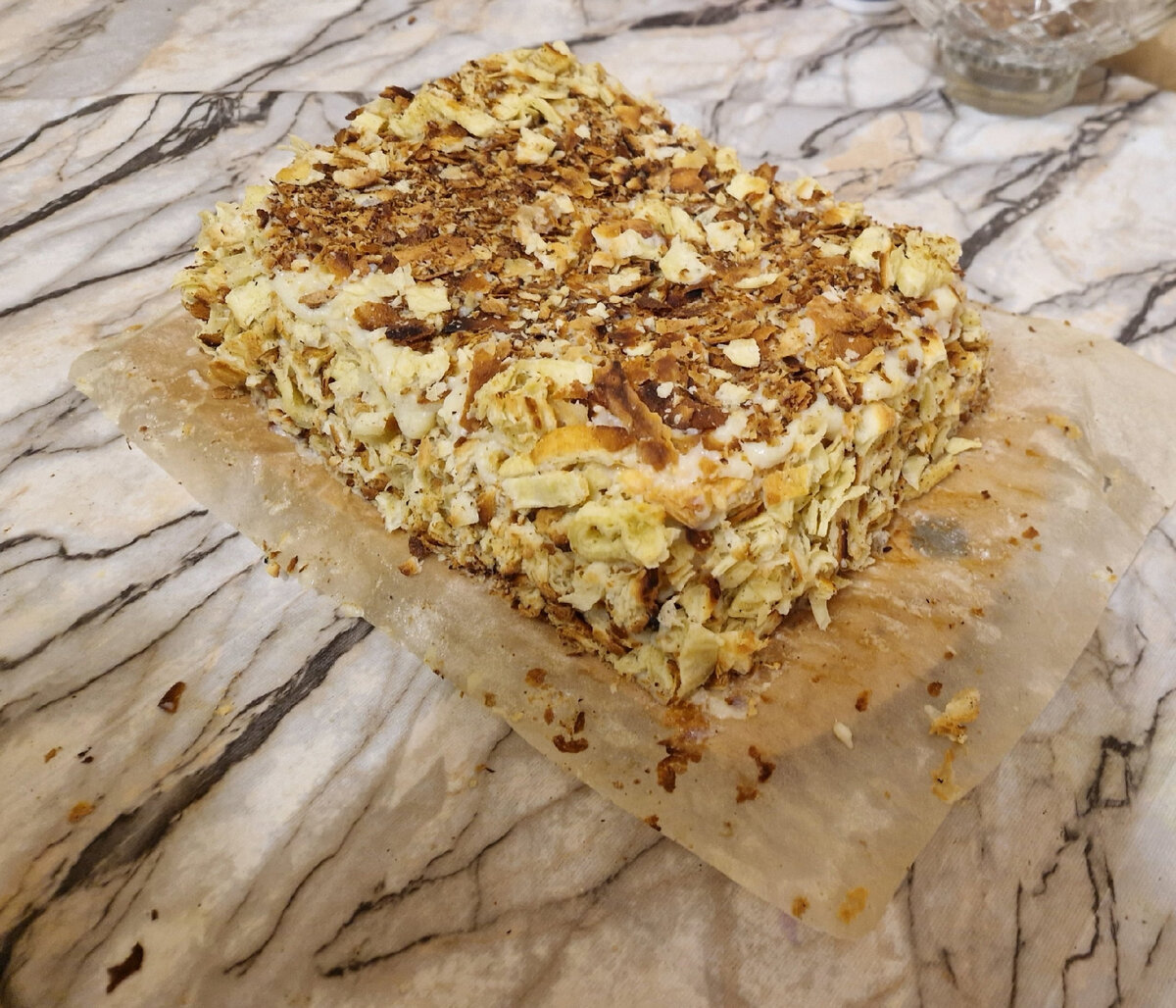 В России и странах бывшего советского союза историю создания торта «Наполеон» принято связывать с личностью и следом в истории французского императора Наполеона Бонапарта. По одной из самых распространенных версий первый рецепт этого потрясающего лакомства появился в 1912 году – накануне 100-летнего юбилея освобождения столицы Москвы от французов. Ингредиенты: Куриные яйца - 4шт. Молоко - 1 литр Слоёное тесто (дрожжевое) - 2 уп. Сахар - 400гр Пшеничная мука -100гр Ванилин -2гр Первое с чего мы начнем приготовление нашего торта с разморозки теста и приготовления всех ингредиентов. Для измерения всех граммовок я использовал мерный стакан, весы кухонные тоже вполне подойдут. Духовку предварительно разогреваем до 200 градусов. В глубокой посуде смешиваем куриные яйца, муку, ванилин и немного молока. Смешиваем все до однородной массы, это будет наша яичная смесь, она нам пригодится чуть позже Берем небольшую кастрюлю и вливаем туда оставшееся молоко и сахар, ставим на плиту и доводим до