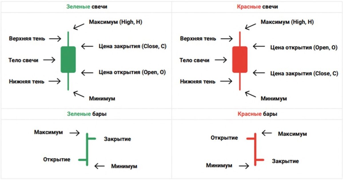 Обычно инвесторы используют графики из свечей или баров. Бары аналогичны свечам, но выглядят иначе. Линейное отображение почти не используется, потому что содержит мало информации. Японские свечи — вариант графического отображения изменений цены за определённый промежуток времени (таймфрейм). Бычья свеча (отображается зелёным цветом) говорит о том, что за заданный промежуток времени цена выросла. Медвежья свеча (отображается красным цветом) говорит о том, что за заданный промежуток времени цена снизилась.