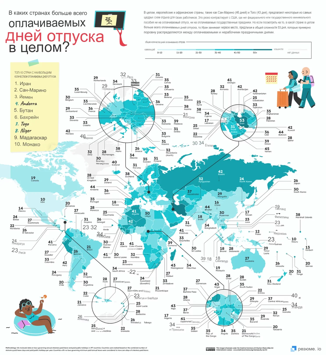 Портал Resume.io проанализировала законы, регулирующие ежегодный оплачиваемый отпуск по закону и оплачиваемые праздничные дни в 197 странах мира. Государства ранжированы на основе общего количества дней отдыха, на которые выделяются средства. Исследователи отмечают, что работодатели не всегда соглашаются платить и крайне неохотно дают отгулы.