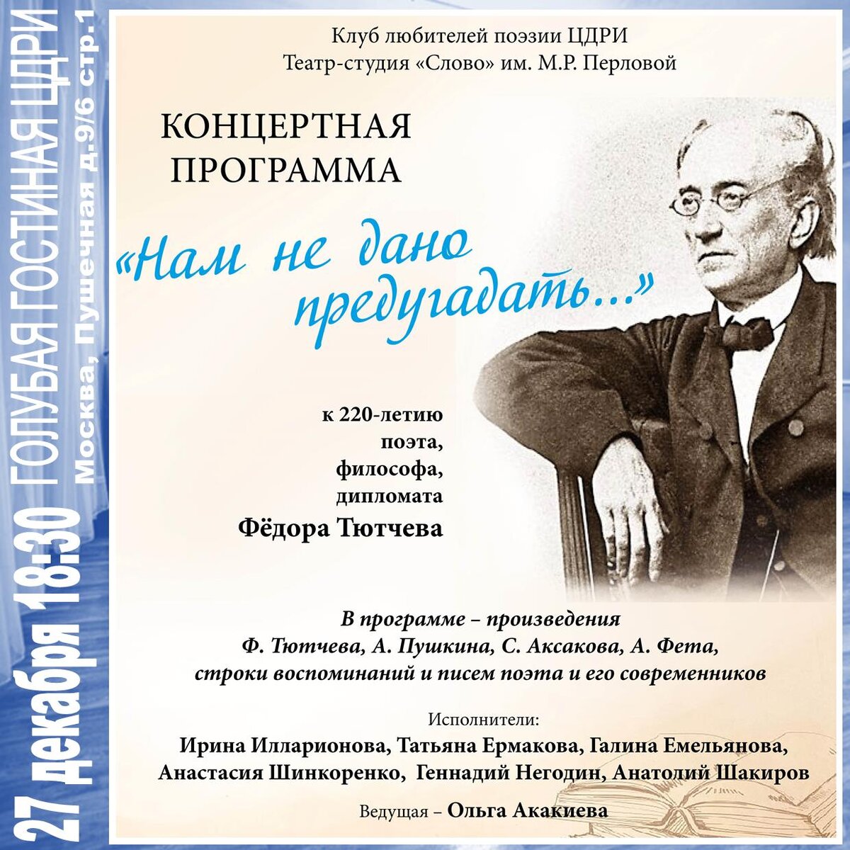 К 220-летию поэта, философа, дипломата Федора ТЮТЧЕВА Клуб любителей поэзии ЦДРИ и Театр-студия «Слово» им. М.Р. Перловой В программе — произведения Ф. Тютчева, А. Пушкина, С. Аксакова, А. Фета, строги воспоминаний и писем поэта и его современников. Исполнители: