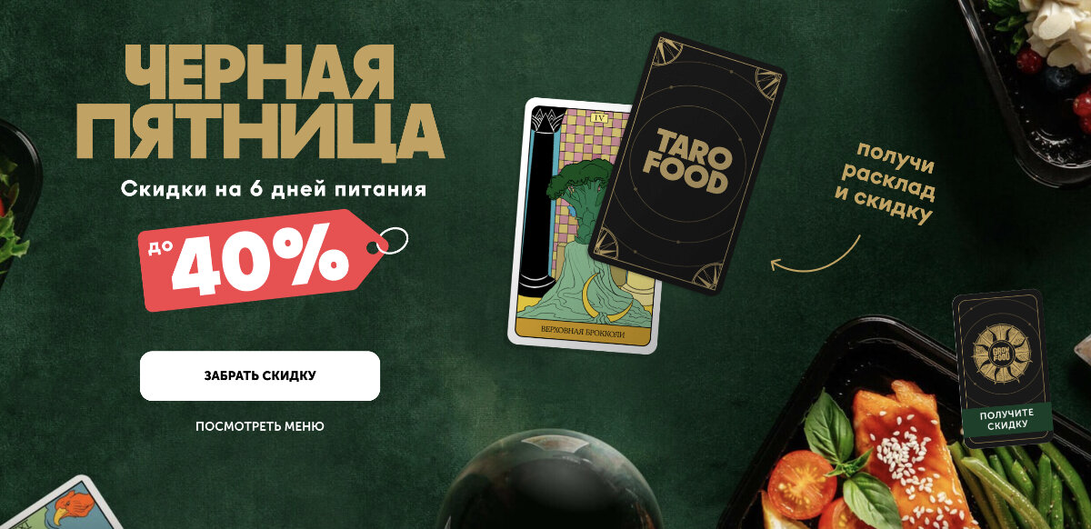 Мой любимый Grow Food придумал акцию удивительной щедрости — максимальная скидка на доставку готовой еды составит…. 40%. Да-да, это не шутка! А чтобы получить такую скидку, надо погадать на картах Таро). > ***** Такие шикарные предложения обычно появляются накануне какого-нибудь события — праздника, круглой даты или дня рождения компании. Но сегодня другой случай. Через пару дней стартует «Чёрная пятница» — день, когда в магазинах огромные скидки. Термин «Чёрная пятница» появился в конце 1960-х годов в Филадельфии. В один из дней владельцы магазинов, не сговариваясь, устроили массовые распродажи. Слухи о гигантских скидках дошли до каждого жителя города, и весь город высыпал на улицы. Для полиции наступила… «черная пятница», ведь полицейским пришлось работать не покладая рук. С тех пор этот термин стали использовать все без исключения. Что предлагает Grow Food Что же приготовил Grow Food к «Черной пятнице»? Целую серию скидок, которые спрятаны за магическими картами Таро. Открывая ка