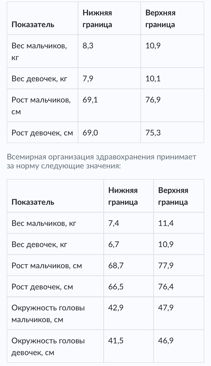 Согласно данным отечественных педиатров, нормы роста и веса для мальчиков и девочек десяти месяцев выглядят так: