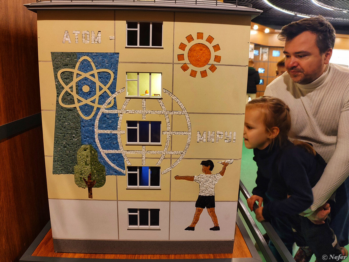 В одном из залов павильона "Атом" установлен макет дома. Обычная пятиэтажка, вроде ничем не примечательная. Разве что изображением на стене: "Атом - миру". Посетители подходят и заглядывают в окна, что они там высматривают? Это не просто макет дома, он сделан достаточно реалистично, внутри жители, каждый занимается своими делами. В одном квартире парень фотографирует девушку, в другой - хозяйка готовит обед, в третьей - застолье. Забавный эпизод, где тетушка моет пол, прямо так и слышится - "Ноги подыми". Есть человек, похожий на Курчатова. Оказалось, это реально существующий дом. На табличке написано: дом № 102, город Краснокаменск. Он построен в 1968 году. Это первый дом в городе. Посмотрите, как это выглядит на видео. Можно реально заглянуть в окна :) Краснокаменск находится в Забайкальском крае. Изначально возник поселок при Краснокаменском железорудном месторождении, геологи обнаружили месторождение урана, который был необходим для атомной промышленности. Город делится на микрора