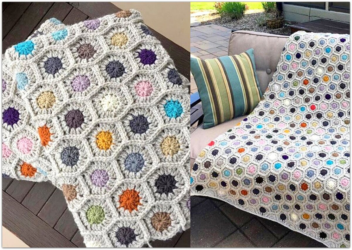 Наверняка у каждой из вас есть остатки пряжи🤔. Их порой настолько много, что начинаешь ломать голову куда бы их деть. Некоторые оттенки мы компонуем. Но есть такие цвета, что никак не придёшь что с ними сделать и куда их деть. Так и валяются из угла в угол. Сегодня вашему вниманию предлагаю несколько вариантов пледов или накидок, кто как назовет. Вяжутся они вот именно из тех остатков, которые занимают место и пылятся в наших коробках. Этот интересный вариант связан при помощи крючка. Это простые круговые ряды с цветными сердцевинами. Эта техника позволяет использовать любые цвета и расставлять их так, как карта ляжет. Каждая деталь вяжется отдельно, затем с помощью крючка мы сшиваем их друг к другу. Этот вариант больше подходит как накидка, чем плед. Кто меня не знает, раскрою вам секрет - Я очень люблю шишечки. Если я вижу в вязанных вещах их, первым делом рассматриваю эти варианты. Безумно красивый плед, оттенки пряжи просто завораживают. Схему предложила. Если например, взять дет