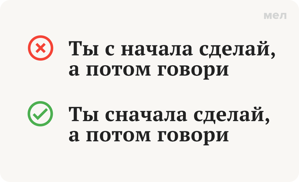 Есть вещи, о которых можно говорить бесконечно. Например, слитное написание наречий и умение отличать их от существительных с предлогами. Сегодня снова вспоминаем об ошибке, которая регулярно появляется в ваших переписках. Правильно: сначала Итак, начнем с начала. И разберемся, почему мы только что использовали раздельное написание. Слово «сначала» относится к наречиям с пространственным и временным значением, которые отвечают на вопросы «как?», «куда?» или «когда?». Такие наречия пишутся слитно. Вот несколько примеров: Но в случаях, когда в предложении появляется пояснительное слово, слово «начало» и предлог «с» следует писать раздельно. Как же научиться отличать наречия от существительных с предлогами? Есть один несложный метод — просто подумайте, используется ли тут существительное в своем прямом значении и есть ли у него зависимое слово. Если на оба вопроса можно ответить утвердительно — пишем раздельно. Пример: У матча было начало? Было — матч начался ровно 20 минут назад. У «нача