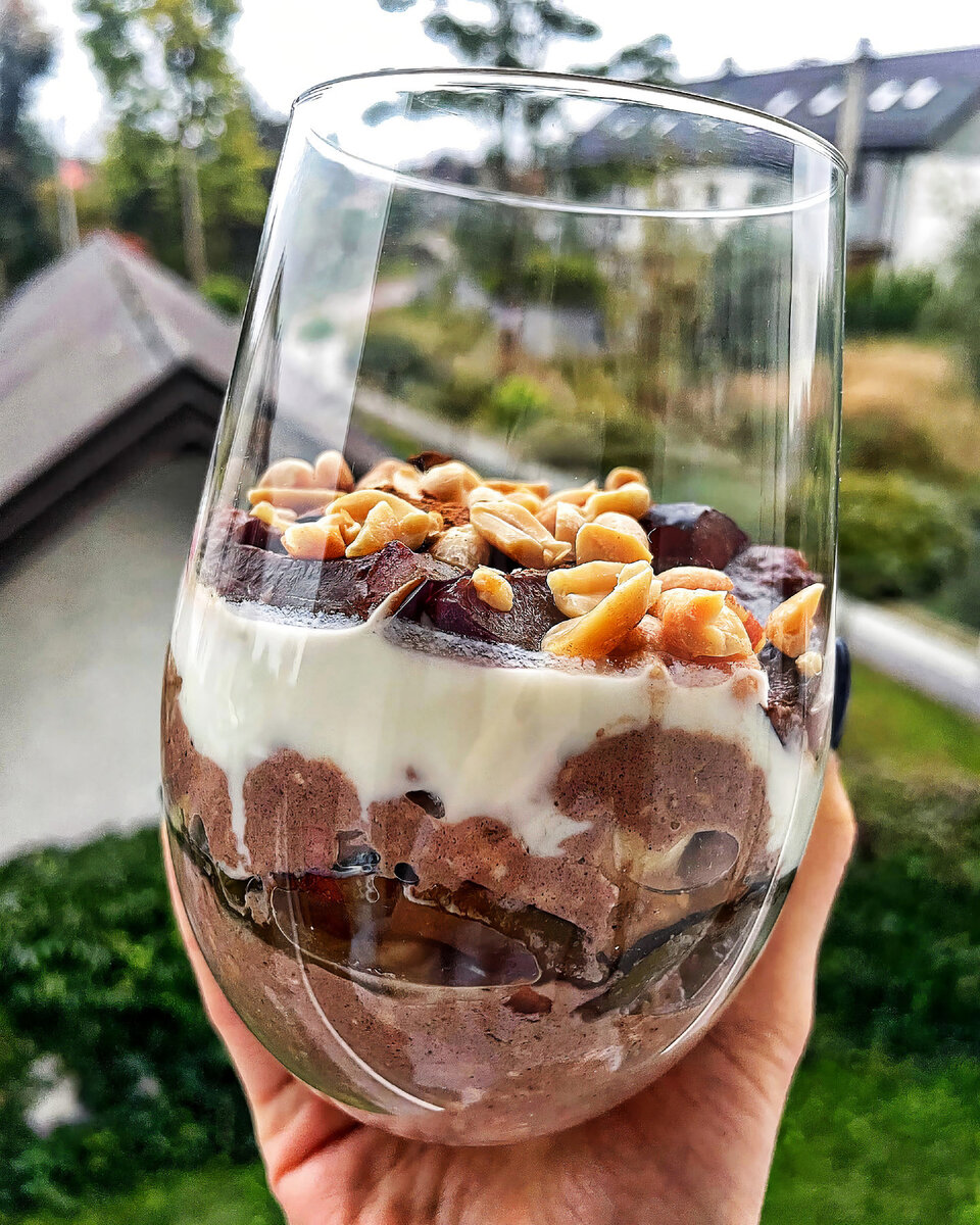 Овсяные хлопья смешать с какао, затем добавить йогурт, молоко и снова перемешать. На дно банки выложить 1/3 часть смешанных овсяных хлопьев. Накрыть половинкой нарезанного банана и черносливом, разрезанным на четвертинки. Затем сверху выложить еще часть хлопьев и банан. Добавить оставшиеся хлопья, 3 столовые ложки йогурта и оставшийся чернослив. Сверху посыпать корицей и орехами.