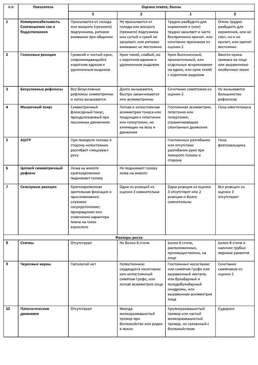 Из статьи вы узнаете, как самостоятельно оценить уровень психомоторного развития своего ребенка в возрасте 1 месяца. В статье приведен способ количественной оценки психомоторного развития месячного ребенка, предложенный кандидатом медицинских наук Журбой Л.Т. и доктором медицинских наук Мастюковой Е.М. Так как каждый ребенок уникален, а нормы вариабельны, были разработаны специальные таблицы, количественно оценивающие степень развития. Описание метода В таблице во втором столбце отображены показатели, характеризующие поведение и навыки ребенка, отклонение которых от нормы может говорить о патологии в развитии. Далее идут столбцы оценки от нуля до трех баллов. Три балла – оптимальное развитие оцениваемого показателя, а ноль баллов – отсутствие развития. Вопросов всего 10, поэтому лучшей оценкой развития ребенка на данном этапе является 30 баллов. Оценка в 27-29 баллов в большинстве случаев расценивается как вариант нормы. Однако, если баллы снижаются по показателям из факторов риска, то
