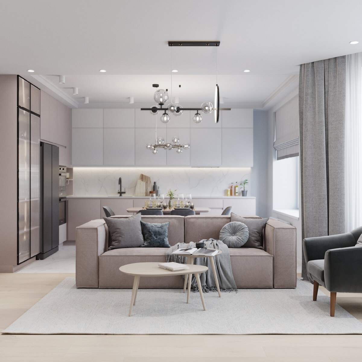 Невероятно нежная гамма кухни-гостиной располагает к отдыху, расслаблению и теплому семейному общению. Пространство разделено на две функциональные зоны: кухни и гостиной. Но они связаны между собой единой цветовой гаммой – нежными оттенками пыльной розы, сливочным и нежно-серым. Зона кухни детально продумана, согласно пожеланиям заказчиков. Зона гостиной включает уютную композицию из вместительного диван и кресла. Проект выполнен для студии МАКСИМАДЖИ | студия дизайна интерьеров Если вам необходимо разработать дизайн-проект квартиры или дома или получить консультацию дизайнера, я с радостью вам помогу. Вся подробная информация есть на моем сайте designbudet.ru