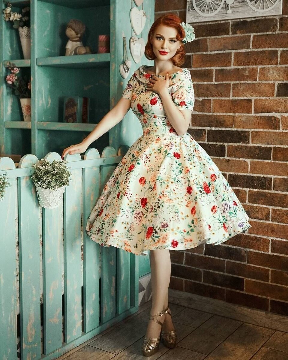 Для этого идеально подходит платье с принтом мильфлёр. Только вот модели с глубоким декольте, обилием украшений и разрезами до бедра не подойдут. Скромность и лаконичность — вот то, на что мы должны опираться, создавая образ простой девушки из деревни, коих раньше было немало.