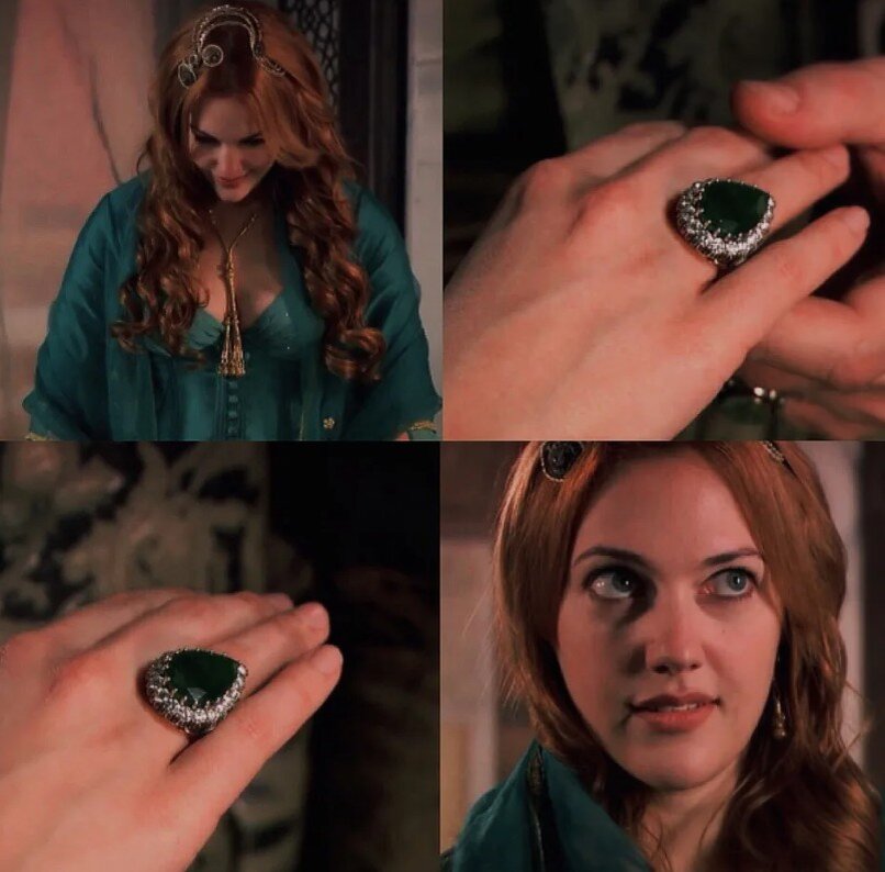 Уже в первой серии этого сериала мы видим это знаменитое изумрудное кольцо, на этот раз принадлежащее Сафие Султан. В ходе сюжета оно переходит к Кесем, а затем к Турхан Султан, по приказу которой была свергнута Кесем.