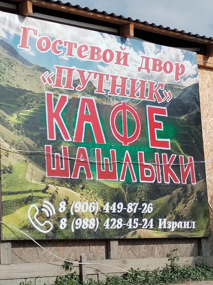 Прекрасные горы Дагестана. Милые жители гор. Переночевав в глэмпинге Абрикос Village в горах (см. часть 4), мы поехали к небольшому источнику в виде водопада спускающегося с гор (недалеко от глэмпинга, у дороги, не пропустите точно), набрали питьевой воды (вода горная, можно пить (кстати, во Владикавказе также много источников в горах и её можно пить, см. часть 1 Владикавказ), и поехали в село Чох. На пути (прямо у дороги) встретили вот такое семейное кафе. Сначало сомневалась можно ли здесь есть, переживала за ребёнка. Но зашла внутрь, заглянула на кухню и успокоилась, чисто, вода есть. Заказали, конечно же, абрикосовую кашу 2 порции (писала про неё в 4 части, обязательно попробуйте), омлет ребёнку, муж себе заказал глазунью, взяли ещё лепешку, и конечно "чуду" - национальное дагестанское блюдо, готовится с разной начинкой (творог, зелень, тыква), рекомендую. Хозяин заведения разделывал барашка на улице, варил шурпу. Предложил нам шашлык, но мы ещё не завтракали, а тут уже сразу п