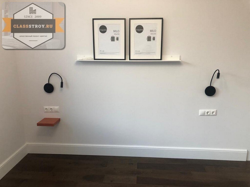 Фотоотчет по ремонту квартиры в Химках, вторичное жилье, 1 комнатная квартира, срок 2 месяца, 2022 год. Стены покрашены, пол паркетная доска, плинтуса из дюрополимера, треки, бра, ниша батареи и др.