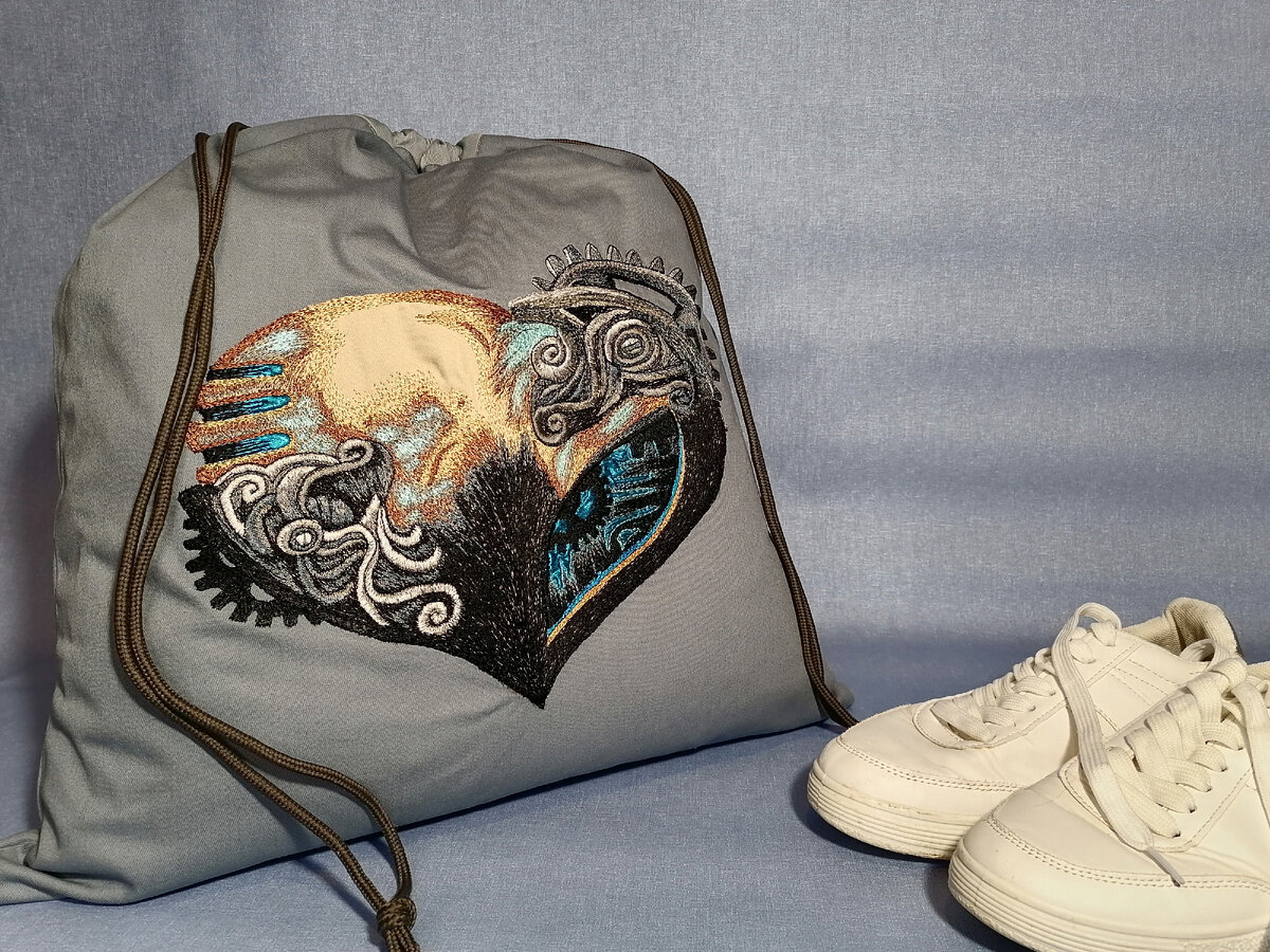 Вещь готова и уже уехала к своей хозяйке. А пока немного тонкостей работы: основой стала строчевая гладь с элементами аппликации, хотя изначально планировалось, что всё будет наоборот. Но рисунок поднял бунт, потребовал больше чёрного, скользнул в антиутопию и подчинил меня своей воле. По опыту знаю, что в некоторых случаях не стоит оказывать сопротивление, вышивка этого не простит. Разумеется это только те случаи, когда заказчик полагается на мой вкус. На самом деле с такими заказами всегда связано много эмоций, много экспериментов и «опыт в копилочку».