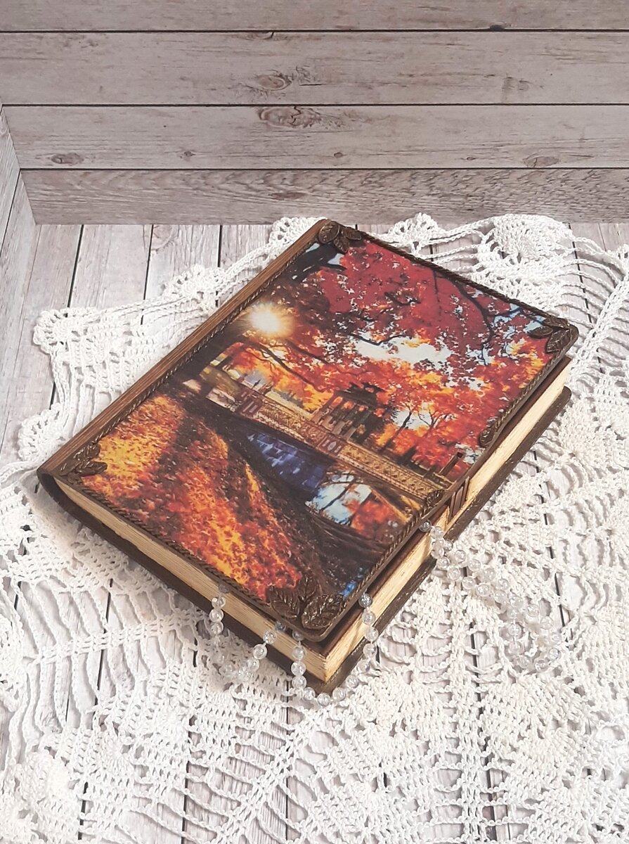 Я всегда любила книги, традиционные, бумажные, с благородным шелестом суховатых страниц и увлекательным миром внутри. И эта форма - раскрывающаяся обложка, под которой хранится ценность (будь то сказка или материальная памятная вещь), - притягивает меня и в рукоделии. Знакомьтесь - моя новая книжечка, шкатулка. Совершенно осенняя, завершу ей череду работ сезона, чтобы уж с чистой совестью окунуться в зимнее творчество! Понадобилось: Заготовка у меня сборная. Поэтому первый этап - сборка и склеивание деталей клеем ПВА: Получаем шкатулку размерами 15х21х3 см: Грунтуем обложку белым акрилом: После просушки шлифуем наждачкой и приклеиваем мотив (картинку предварительно покрываем акриловым лаком и тоже сушим): Заднюю оставим без грунтовки. Через трафарет наносим шпатлевкой узор, имитирующий дерево, по углам добавляем маленькие листики: Пока обложки сохнут, создаем книжный блок - наносим равномерный тонкий слой шпатлевки и зубочисткой прорисовываем странички: После просушки окрашиваем блок