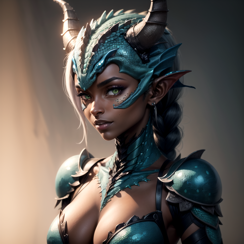Здесь промт звучал уже так: одна женщина, (темная кожа: 1.3), детальные зеленые глаза, кокетливая, (длинные черные волосы, заплетенные в косу: 1.2), (сексуальная), козлиные рога, (детализированная синяя чешуйчатая кожа), (замысловатая синяя чешуйчатая драконья броня: 1.2), смотрит на зрителя, (фотография среднего плана), (фон тропического пляжа), реалистично