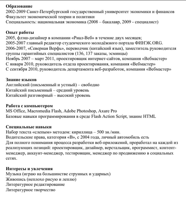На картинке — текст из резюме, которое я им отправил. Для 26 лет — очень наивно и смешно. Но это было моё первое резюме в жизни. В предыдущие разы при устройстве на работу я показывал какие-то артефакты по выполненным проектам (технические задания, прототипы) — и этого всегда было достаточно.