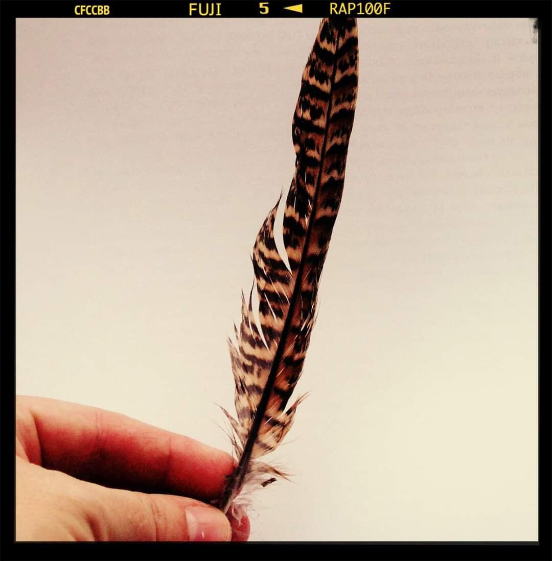 Сегодня я заработала еще один диплом) Смеюсь) У меня уже есть диплом по зайцу, а теперь еще и по фазану) Супруг на рыбалке, погода - великолепная, практически весна, пошли мы с Пулей на поле прогуляться, гантель потаскать, зайцев погонять. Я, как опытная зайцеловка, уже знаю - где примерно у зайцев может быть лежка и Пулю туда не вожу) И вот, спокойно себе прогуливаемся, гантельку кидаем - приносим, а тут Пуля натянулась, как струна, лапу подняла, стойку сделала, пока я очухалась - она как ломанулась по полю, я за ней. Пу бежит - визжит в охотничьем азарте, я бегу за ней - ору. Фазаны, надо думать, обалдели от такой атаки. Я уж не знаю - успела Пуля хапнуть фазана или он от страха сам перо скинул, только вернулась Пу с трофеем - вот этим пером. Вот па ра зиты, уду шила бы, нашли где прогуливаться, как будто места мало, Сясю мою дразнят))