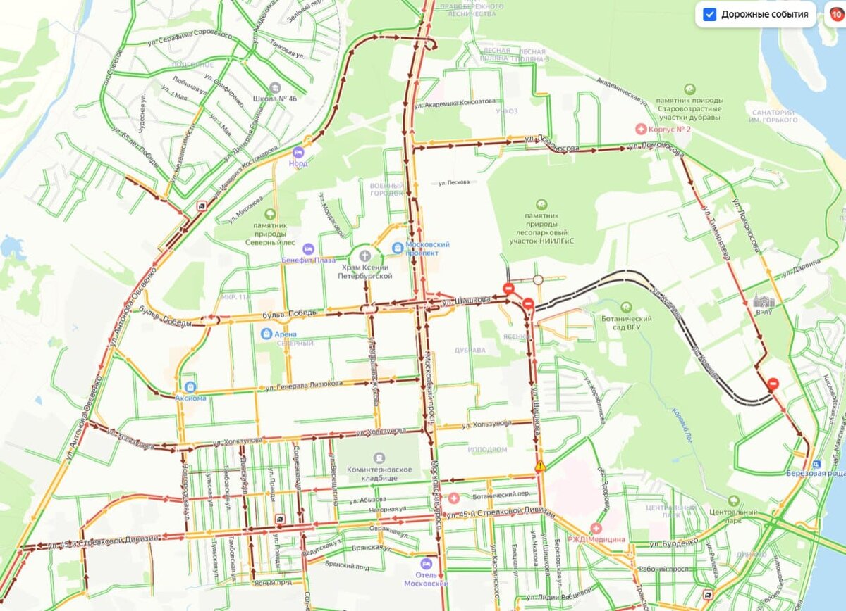 Ближе к полудню пробки в Воронеже снизились до уровня в 8 баллов, отметили в городском управлении транспорта. Там напомнили, что утром уровень заторов достигал максимальных 10 баллов. Но и 8 баллов означают, что движение в городе чрезвычайно затруднено. В управлении транспорта обратили внимание, что интервалы движения маршрутных автобусов из-за этого оказались «сбиты». – При выходе с конечных остановок подвижной состав, так же как и другие транспортные средства, попадает в заторы, – пояснили в мэрии. Управление, как и положено, ведет постоянный мониторинг распределения автобусов на линиях. Из-за сегодняшних пробок отмечается неравномерное их распределение, при том что в определенных частях города автобусы просто скопились. Со своей стороны власти принесли извинения пассажирам за неудобства и заверили, что прикладывают все усилия для нормализации работы общественного транспорта.