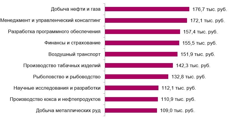 Предсказуемо самые высокие зарплаты в стране получают нефтяники и газовики. В месяц они могут рассчитывать на 176,7 тыс. руб. до вычета подоходного налога. Хорошо зарабатывают топ-менеджеры и консультанты по управлению (172,1 тыс.), а также программисты (157,4 тыс.).
