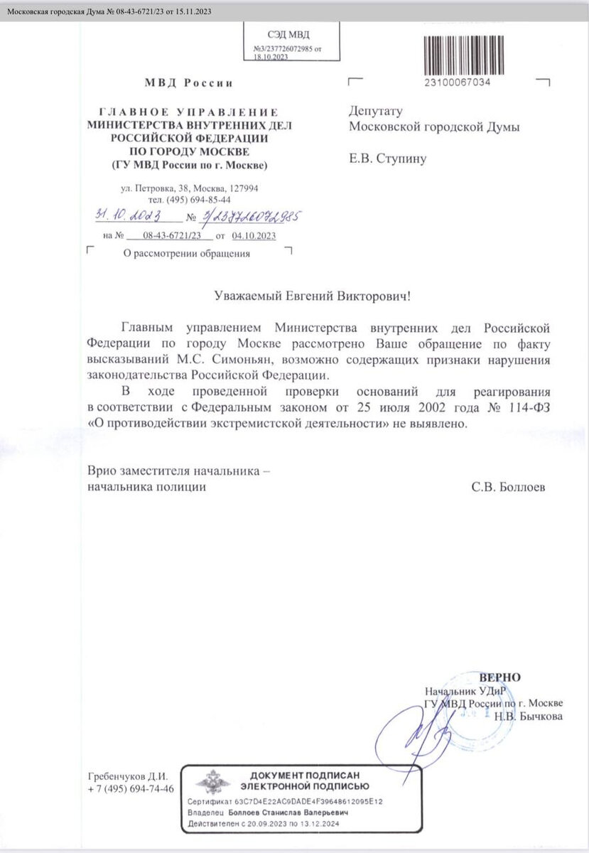 МВД не нашло признаков экстремизма в словах Маргариты Симоньян о ядерном взрыве над Сибирью ГУ МВД России по Москве не нашло признаков нарушения законодательства в словах главы RT Маргариты Симоньян о том, что будет после ядерного взрыва «где-нибудь над Сибирью». Об этом 20 ноября сообщил депутат Мосгордумы Евгений Ступин* (признан иноагентом). В начале октября 2023 года главный редактор RT и МИА «Россия сегодня» Маргарита Симоньян в авторской программе «Ч.Т.Д.» рассказала, ссылаясь на слова своего знакомого инженера-радиоэлектроника, что «если произвести взрыв в сотнях километров» над Сибирью, то вместо ядерной зимы люди вернутся в «год эдак 1993-й». Симоньян заявила, что в этот момент из строя выйдет радиоэлектроника и спутники. «Чудесно же жили», — уточнила тогда главред RT. Средства массовой информации, соцсети и некоторые политики восприняли заявление Маргариты Симоньян как призыв к ядерному удару. Тогда помощник депутата Ступина Николай Королев обратился в Следственный комитет и
