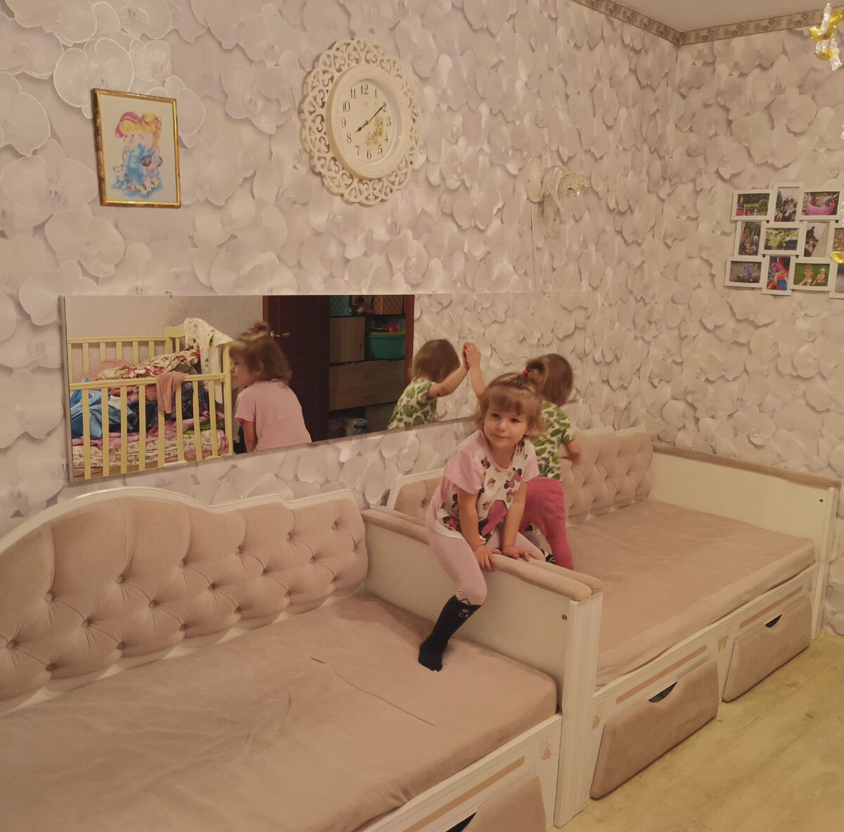 Добрый день, уважаемые читатели! Эти выходные у нас пролетели незаметно. Их конечно, всегда мало, но в этот раз мы их совсем не видели. Началось всё с того, что Оле стала маловата кровать. Она ещё не упиралась головой, но уже было тесновато. Поэтому на прошлой неделе я озадачилась и стала выбирать кровать. Сначала хотела только старшей, но после того, как присмотрела вариант, пришлось брать двоим. Побоялась, что потом вторую такую мы не купим и надо хватать сразу.🙈 Но зря в интернете их навалом. Вообще, изначально не хотелось спальню для принцесс. Думалось сделать что-то простое и светлое, но чтобы было много мест хранения. Всё-таки девочки и вещей прилично. К тому же так как дочки две, да ещё и с небольшой разницей в возрасте посчитали, что лучше чтобы у каждой было свое отдетение в шкафу. Не просто полка. Приобрели не темные обои. Как мне казалось, довольно нейтральные. Мебель белого цвета, очень даже вместительную. Детские кроватки у нас были цвета "слоновой кости", но они был