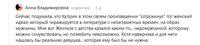 Если еще подумать, то неестественных момента даже два. Первый - выбор в качестве объекта почти религиозного поклонения живого человека. Второй - самоустранение от всех традиционных мужских жизненных задач. Ничего не интересует! Никаких занятий даже не ищет. Отпущенные ему свыше ресурсы уходят вникуда. Точнее, даже отчасти на разрушение. Ведь если служение абстрактному, недостижимому и непостижимому Божеству вряд ли этому Недостижимому сильно докучают, то реальной живой Вере и ее близким поклонение Желткова докучают очень сильно.