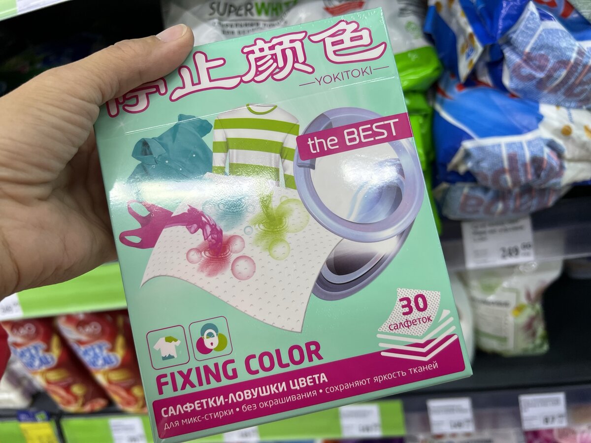 Что такое "уловитель цвета" я, признаться, и не знала до этого. Много лет белье перед стиркой сортировала: белое, цветное, черное. Да, наверно, вы все так делали. Но прогресс не стоит на месте - все, для нас, ленивок, новинки штампуют. Особенно стараются китайцы! Вот, посмотрите только, что придумали! Увидела я это "чудо-средство" в фикс-прайсе и мимо бы прошла. Но читатели мне написали, что вещь так-то хорошая. И жизнь слегка облегчает. И не только холостякам, которым лень заморачиваться с разбором белья по категориям. Но и дамам семейным. Решено, беру на тест! Цена вопроса - 149 рублей. Вот так выглядит коробка с "ловушками цвета". Внутри, как и обещали лежат некие "салфетки". По виду это похоже на тряпочки для уборки, которые продаются в рулонах, на манер бумажных полотенец. Но не из бумаги, а из какого-то не тканного материла. Довольно маленькие по размеру. Согласно инструкции, салфеток на стирку нужно 1-2 или даже 3 (если случай тяжелый). У меня как раз такой! Я стираю и кремовую