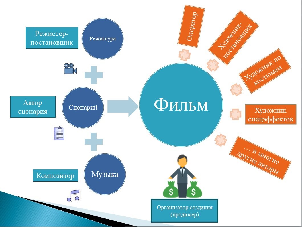 🔸 Сложные объекты, как правило, требуют высоких организационных и финансовых вложений, который обычно принимает на себя организатор создания или изготовитель. Для аудиовизуального произведения – это продюсер.