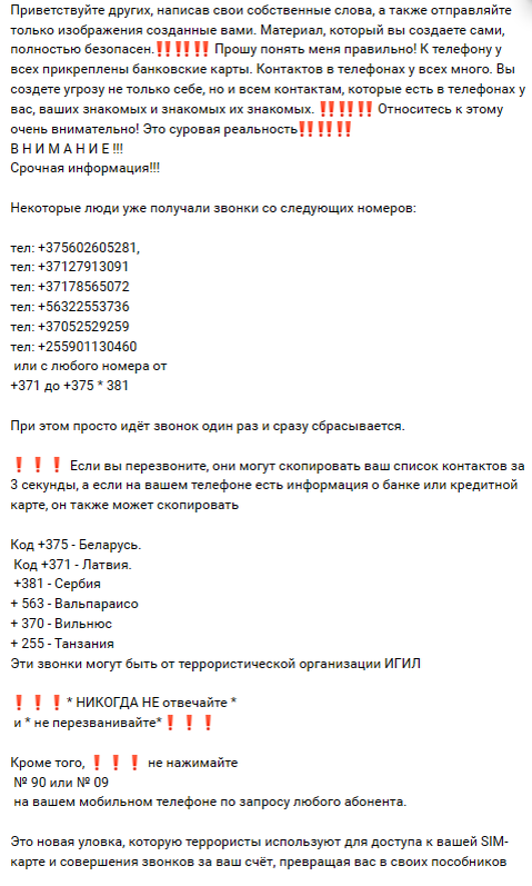 В сети распространяют памятки, где предупреждают об опасности вирусных картинок в соцсетях и мессенджерах, перечисляют номера, на которые нельзя отвечать и которым нельзя перезванивать, а также предостерегают от того, чтобы нажимать сочетание #90 или #09 на мобильном устройстве. Однако информация по большей части является недостоверной. Так, сообщение о возможной опасности передачи открыток в фото и видеоформате в соцсетях и мессенджерах не подтвердилось. Опасность могут представлять вредоносные ссылки, которые ведут на фишинговые сайты, но не сама картинка. Что касается фрагмента памятки, где предупреждают о звонках от якобы террористической организации ИГИЛ (запрещена в РФ), то в 2017-2018 годах в Европе была зафиксирована волна телефонного мошенничества. Предупреждения перешли и на русскоязычный сегмент интернета. Если вы увидели пропущенный вызов с телефонного номера, в котором присутствует зарубежный код, перезванивать не нужно. Так как суть данного мошенничества как раз заключает