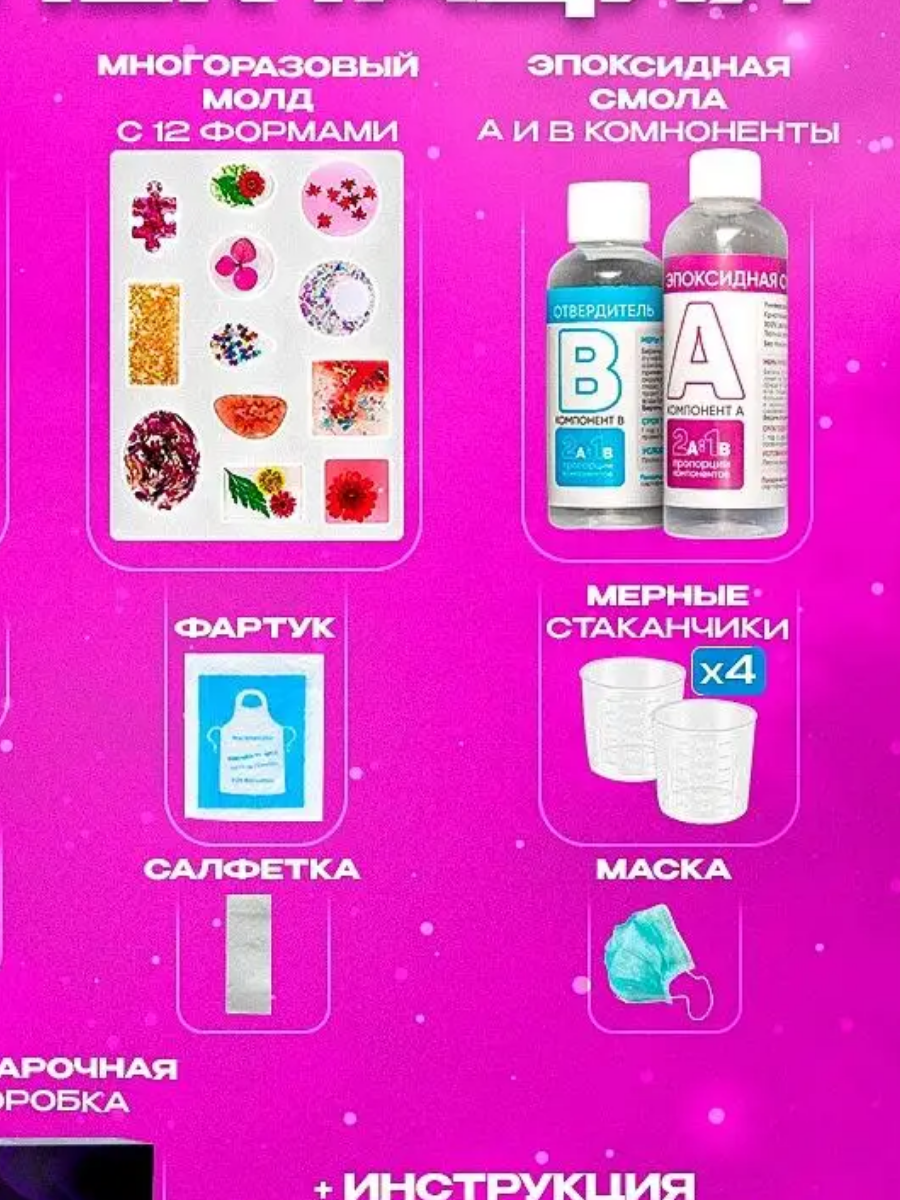 Недавно в общении с соседками, в качестве подарка для девочек на новый год, я порекомендовала набор с эпоксидной смолой. Буквально летом моя дочь и её подруги увлеклись поделками – из биссера и эпоксидной смолы. Они с удовольствием творили, просили помощи в работе и менялись своими поделками: колечками, брелоками, кулонами. Мы с соседками залезли на маркетсейл и тут же среди популярного наткнулись на 2 стандартных набора: один с 2 компонентной смолой и второй – с УФ. Преимущества УФ смолой сразу привели меня в восторг, ведь не надо ждать 24 часа до полного застывания и легче работать с сухоцветами, а главное не надо смешивать! Ведь 2 компонентная смола смешивается в четких пропорциях в граммах и без весов тут не обойтись, далее смешивается около 5 минут, затем желательно переливается, чтоб не остались не смешанные части – ну вы поняли какой это весомый нюанс? А тут готовая УФ смола, которую просто заливаешь и высушиваешь специальной лампой, которая входит в комплект – правда звучит к