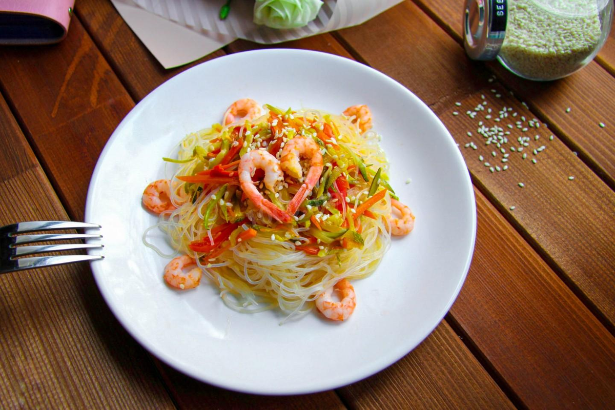 На скорую руку, очень просто и вкусно, на романтический ужин. Фунчоза с креветками и овощами идеально подойдет для подачи на ужин с любимыми. Она хорошо сочетается с вином, сытная, но при этом легкая. И состав продуктов для нее можно изменять в зависимости от сезона и вкуса! Ингредиенты: 1. Фунчоза 200 гр 2. Морковь (крупная) 1шт 3. Цукуни (небольшая) 1шт 4. Болгарский перец (красный) 1шт 5. Растительное масло 2.5 столовых ложек 6. Креветки (очищенные) 100 гр 7. Чеснок 1 зубч 8. Перец чили по вкусу 9. Соль по вкусу 10. Соевый соуч 50 мл 11. Рисовый уксус 1 столовая ложка 12. Кунжут 1 столовая ложка 1 шаг: Как сделать фунчозу с креветками и овощами? Для начала крупную морковь вымойте, очистите и нашинкуйте мелкой соломкой. Чтобы соломка была максимально одинаковой по размеру, можете использовать специальную тёрку для овощей. Так блюдо будет выглядеть аккуратнее. Разогрейте масло на сковороде с высокими бортами. И выложите морковь обжариваться. 2 шаг: Тем временем вымойте болгарский