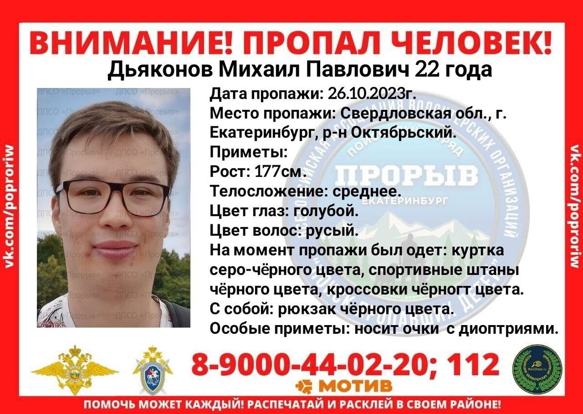 Студент из Петербурга пропал на Урале и уже месяц не выходит на связь 22-летний студент из Петербурга Михаил Дьяконов пропал в Свердловской области. Он почти месяц не выходит на связь. Ориентировку опубликовал поисковый отряд «Прорыв» 20 ноября. По данным E1.RU, Михаил родом из Челябинской области, но четыре года назад уехал учиться в Петербург. В последний раз он говорил с матерью 26 октября. Сын должен был позвонить ей на следующий день, но на связь он больше не выходил. «Первую неделю мы его искали в Питере, только потом узнали, что он в Челябинск прилетел, поехал на автовокзал, а дальше — неизвестно. Мы в области живем, так что выглядело, будто бы домой собирался, но он никогда так сюрпризами не приезжал», — рассказывает изданию мама пропавшего. След молодого человека обнаружили в Екатеринбурге — якобы до 11 ноября он останавливался в местной гостинице. А 16-го числа, как сообщает E1.RU, Михаил приобрел билет до Томска, но сдал его. Так что у родителей остается надежда, что их сын