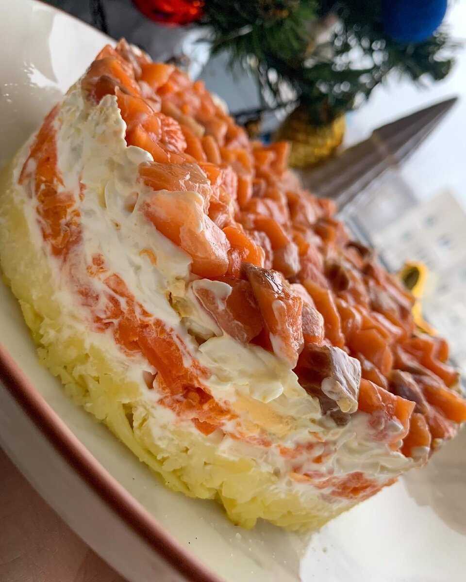 Начинаем потихоньку готовиться к Новому году 🎄 Очень нежный салатик с красной рыбкой. Ингредиенты: - 200 гр. картофеля - 200 гр. моркови - 1 средняя луковица - 3 яйца - соленая красная рыбка 200 гр. - майонез, соль Картофель, морковь и яйца отварить до готовности и натереть на тёрке. Лук и рыбку мелко нарезать. Выкладываем салатик слоями: - картофель, майонез, соль - лук - морковь, майонез, соль - яйца, майонез - красная рыбка Такой салат можно приготовить в виде рулета, необходимо только немного изменить последовательность слоев. Первым слоем на пищевую плёнку выложить морковь, затем картофель, лук, яйцо и рыбку. Не забываем смазать слои майонезом и свернуть салат в рулет. Приятного аппетита 😋