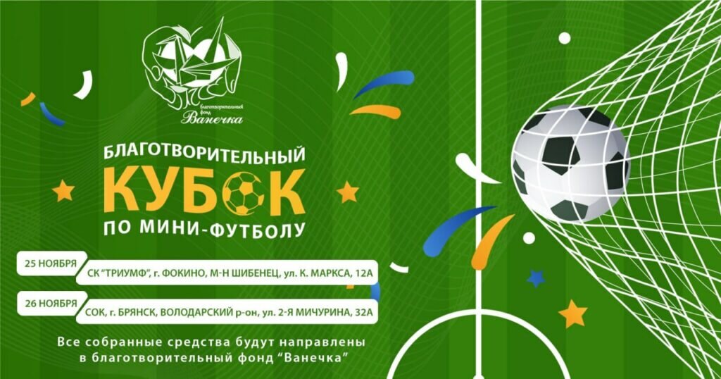 Традиционный турнир по мини-футболу в поддержку подопечных брянского благотворительного фонда «Ванечка» пройдет в городах Фокино и Брянске в ближайшие выходные. Благое начинание поддержат 24 мужские команды из Брянской, Смоленской, Московской областей и республики Беларусь. Соревнования стартуют в спортивном центре «Триумф» в эту субботу, 25 ноября. А на следующий день, 26 ноября, в спортивном комплексе «Брянск» в Володарском районе областного центра пройдут финальные матчи турнира. Начало матчей в 09:00. Вход свободный. 0+ Брянские команды организовали благотворительный Кубок по мини-футболу
