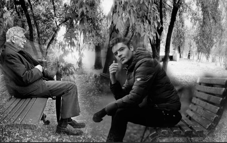 Олег Букач Я давно уже здесь живу, в доме возле зелёного сквера. Он небольшой такой, стандартный городской скверик с тополями, черёмухами и сиренью. И видно его из всех трёх окон моей квартиры. Уже несколько лет, наверное, каждый вечер, если нет дождя или (зимой) не очень холодно, на одну и ту же скамейку выходят Отец и Сын. Я не знаком с ними, но то, что они в родстве, видно даже невооружённым глазом: и разница в возрасте, и необыкновенное сходство, настолько сильное, которое сегодня бы назвали «клоновым». Старик прям, сух, седовлас. И очень красив. Волосы и усы белы. Чёрные же брови подчёркивают жгуче тёмные глаза. Когда он говорит, то под усами приоткрываются крепкие ещё зубы, отчего артикуляция становится особенно красивой. Опирается он на трость. Движется медленно и как-то очень выразительно.
