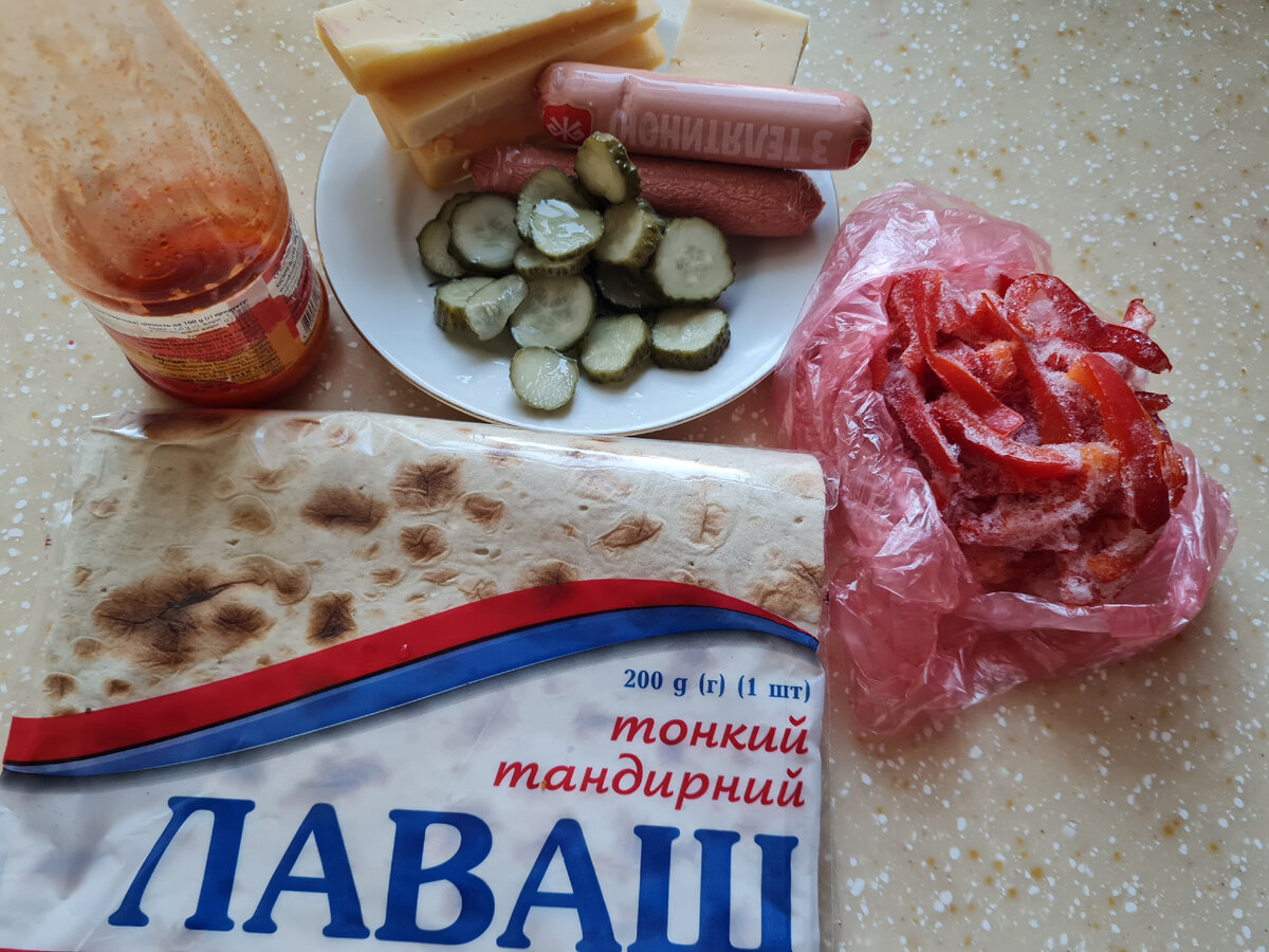 Она настоящая палочка-выручалочка, например, для ленивых кулинаров, так как тесто особое не нужно. И времени на готовку потребуется мало. Плюс и то, что из любых продуктов, которые есть под рукой можно сотворить что-то подобное. В моем варианте оказались в запасе сосиски. Их отлично заменят разнообразные виды мяса – вареного, жареного и пр., колбасные изделия, грибы и др. Вместо соленых огурчиков или вместе с ними можно употребить маслины или оливки, свежие (замороженные) овощи. А смазывать основание не обязательно только кетчупом. Подойдет и майонез, и какие-то еще острые или пряные, или кисло-сладкие соусы. В общем, до бесконечности можно корректировать этот рецепт. Ингредиенты для одной порции: • круглая тонкая лепешка или половина большого прямоугольного лаваша;