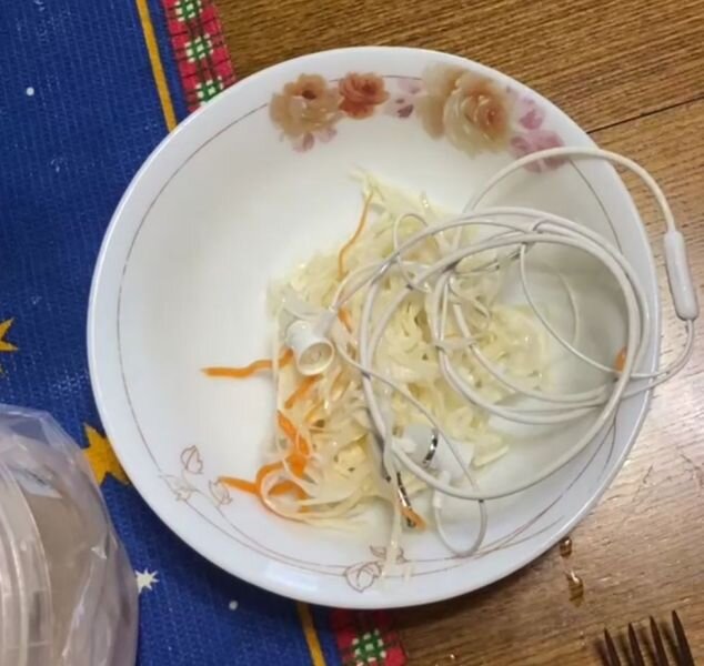 Однако на следующий день, когда большая часть капусты была съедена, почти на самом дне банки местная жительница обнаружила белые наушники. Инородный предмет хорошо «замаскировался» под окружающую среду, так что его было сложно заметить.