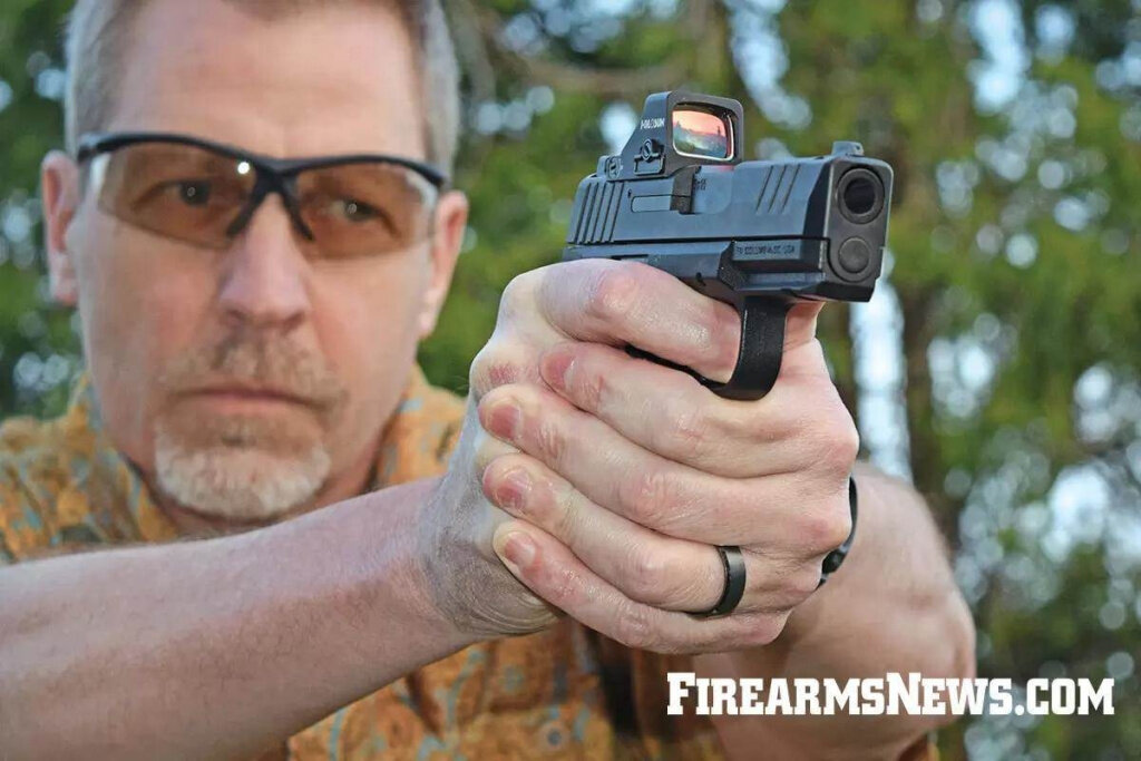 Длина ствола Reflex составляет 3,3 дюйма (8,3 см), а общая длина оружия — 6,2 дюйма (15,7 см). С установленным магазином на 11 патронов и выступом для пальца высота пистолета составляет 4,6 дюйма (11,6 см). Если установить вместо выступающей детали удлинитель магазина, то это уменьшит высоту примерно на треть дюйма. FN сообщают, что пистолет весит 18,4 унциb (522 г) со вставленным пустым магазином; мои цифровые весы показали вес 18,0 унций (510 г) со вставленным магазином на 11 патронов. Я понимаю, почему они поставляют пистолет с удлиненным опорным выступом-пяткой для пальца, ведь это позволяет большинству людей держать оружие всеми пальцами, хотя (скорее всего) с трудом. Магазин на 15 патронов оснащен удлинителем рукоятки и должен позволить каждому удерживать оружие всей рукой, но в данном случае оказывается под вопросом скрытность ношения.
