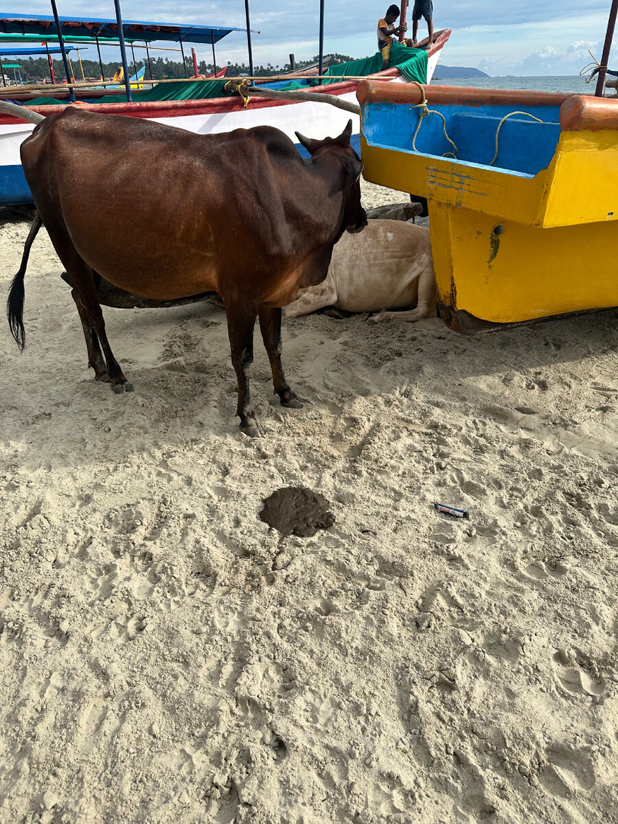 Блуждающие коровы, как по тротуарам, так и на пляже. Собаки, на первый взгляд добрые, но при нас, одного местного парня цапнула до крови. Не говоря уже про вездесущий мусор. Я так понимаю, подобная проблема возникает у многих, впервые посещающих индийский штат Гоа. Сегодня расскажу, как и обещал, про жгучих медуз и кусачих собак. Я с супругой был морально готов и понимал, куда мы летим, а вот дочь (ей 14 лет) это прочувствовала уже по факту, с учетом того, что обычно вы отдыхаем в хороших отелях на "олл инклюзиве", но здесь своя специфика. Хоть я выбрал отличный отель Санатана Бич, да это "трешка", но по многим параметрам и по гоанским меркам, лучше многих 4 и 5* Даже завтрак вполне приличный Пока ехали из аэропорта Даболим в Кандолим (Северный Гоа) где расположен отель Сантана Бич, по дороге уже заметили "местную специфику". Коровы, собаки, везде мусор, лачуги вдоль дороги, зрелище нелицеприятное. Мы приехали в отель примерно к 9.00, обещали заселить пораньше, но при этом, сразу отп