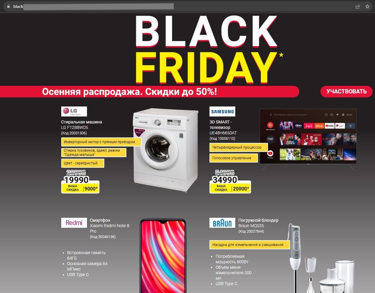 Привет, Дзен! В русском языке "скидка" и "кидать", оказывается, это однокоренные слова. Так что стоит ли удивляться тому, что праздничные акции и распродажи, как магнитом, притягивают к себе жуликов всех мастей. Они идут по четкому денежному следу. В прошлом ноябре россияне потратили на онлайн-покупки 670 миллиардов рублей — это 12% от всего прошлогоднего оборота электронной коммерции. А поскольку, уже в конце этой недели, 24 ноября, стартует BlackFridaySale, специалисты компании F.A.C.C.T. подготовили несколько рекомендаций, как защитить себя в интернете и не стать жертвой этой масштабной онлайн-распродажи. Поговорим вот о чем: BlackFridaySale: фишинг и скам Жулики уже готовятся встретить "черную пятницу" во всеоружии. К примеру, еще на прошлой неделе наши специалисты обнаружили несколько мошеннических ресурсов, которые выдавали себя за сеть магазинов электроники. Под вывеской осенней распродажи обещают скидки до 50%. На этом сайте "продают" стиральную машину со скидкой в 10
