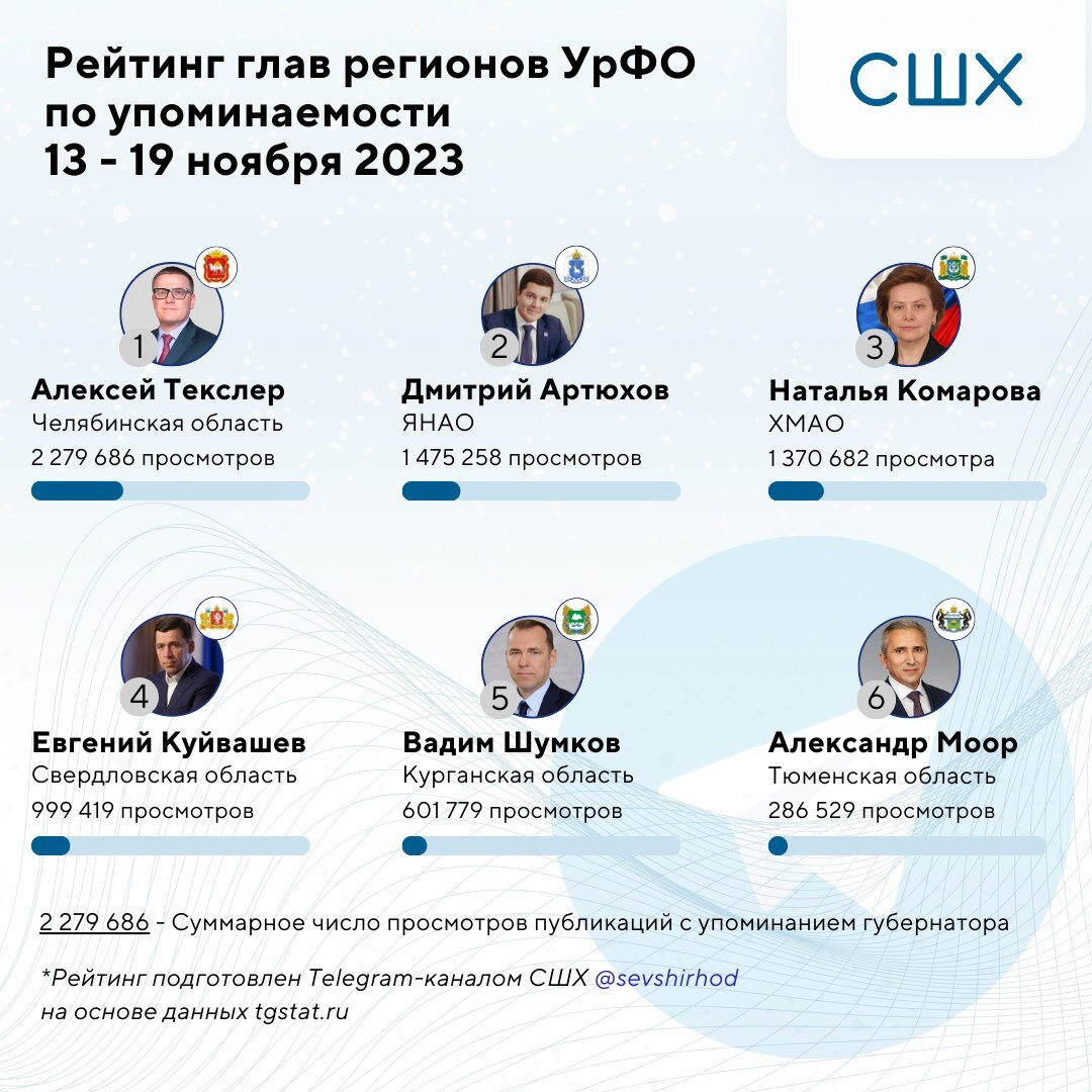 Вторую неделю подряд лидерство в рейтинге по просмотрам в Telegram удерживает губернатор Челябинской области Алексей Текслер — он упоминался в 715 публикациях, собравших 2 279 686 просмотров. Аудитория активно интересовалась строительством метротрама в Челябинске, при этом общий тон публикаций оказался негативным.