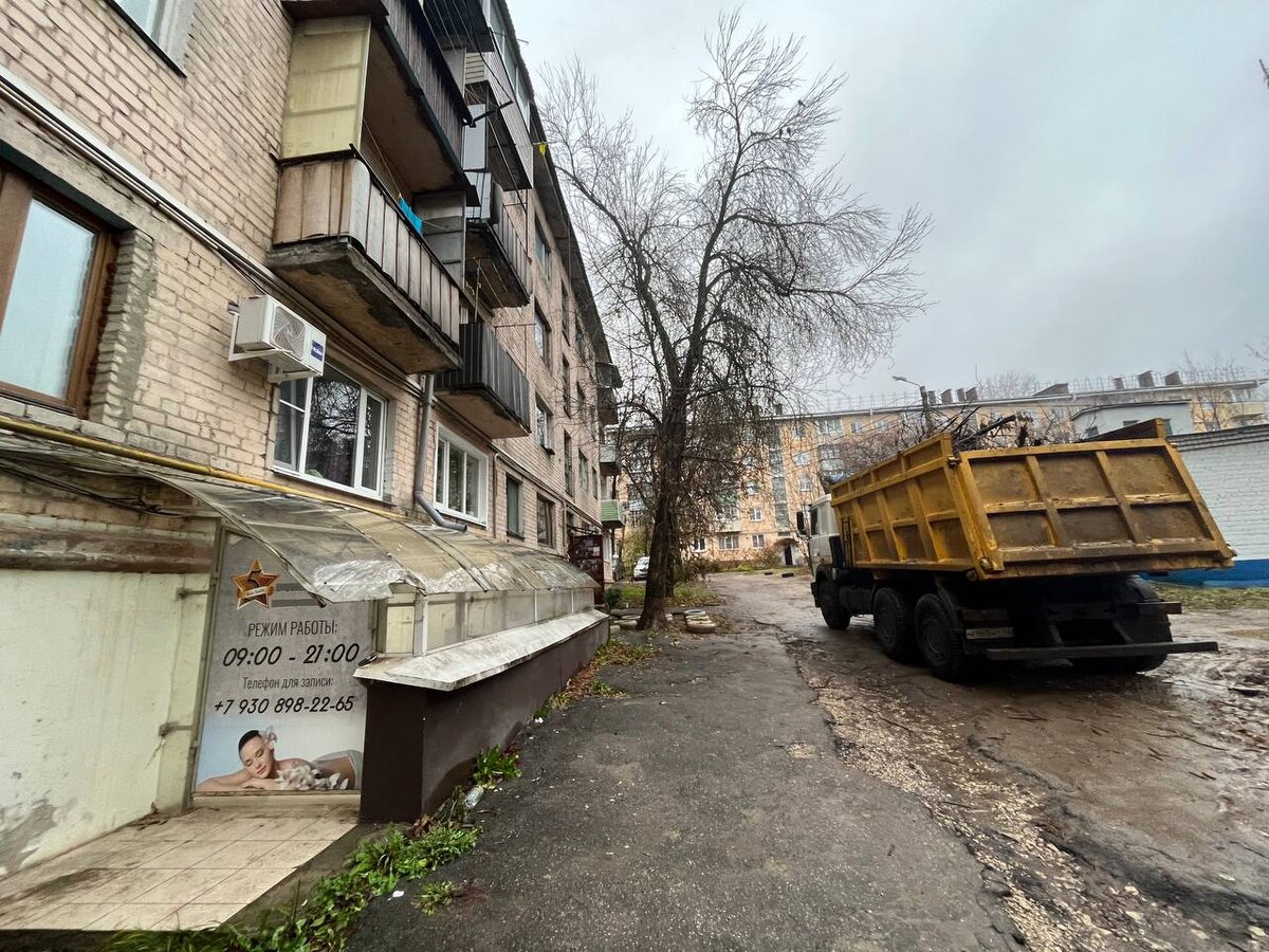 В день нашего приезда во дворе дома работала крупная техника – с земли собирали остатки спиленного дерева. Как оказалось, «Калугатеплосеть» проводила здесь работы по ремонту теплотрассы, дерево, которое мешало проведению работ, спилили.