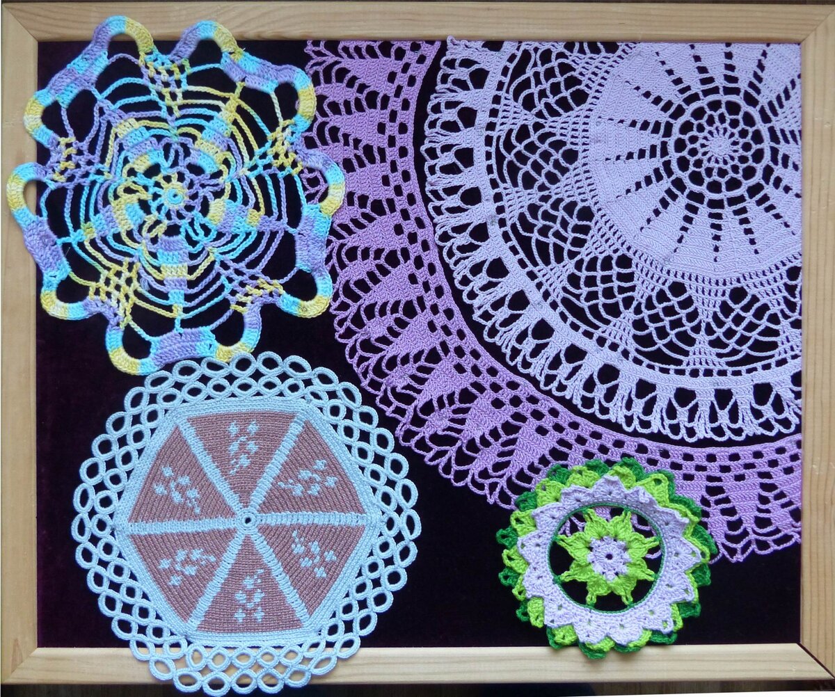 #crochet, #вязаниеКрючком, #кружевноеВязание Закончено описание всех моделей 1 части книги «Вязание крючком в XIXвеке». Далее идут фотографии моделей из 2 части. Названия всех моделей соответствуют первоисточнику. Салфетки Салфетка под графин Эту салфеточку предлагалось вязать из красной и зеленой шерсти, каждой с 6 оттенками. Я взяла зеленые нитки «Нарцисс» и сиреневые «Ромашка». Диаметр салфетки 18см. Салфетку вяжем по спирали за заднюю ниточку, не забывая, что при смене цветов последний столбик заканчиваем провязкой нитью другого цвета. Салфетка «9 лучей» Я связала эту салфеточку в 2-х вариантах: 1)из «Розы», причем в лучах столбики с никидом вязала между столбиками пред. ряда, а в дужках вместо столбиков без накида – цепные петли, 15см в диаметре; 2) из сиреневой «Ромашки» – по описанию, 21см в диаметре. Салфетка «5 лучей» Салфетка связана из нити секционного крашения «Камтекс» 200м в 50г, 23см в диаметре. Салфетка «14 лучей» Салфетка связана из нити «Ромашка», 23см в диаметре. Дал