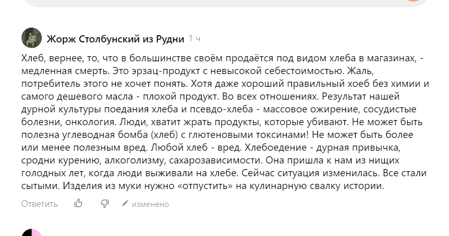 Тем не менее, некоторые уверены: хлеб – это медленная смерть. В интернете всё чаще появляются посты, где хлеб приравнивают к сигаретам, алкоголю и даже наркотикам. Людей пугают "глютеновыми токсинами", говорят, что хлеб вызывает зависимость, ведёт к сосудистым заболеваниям и полностью бесполезен для организма.