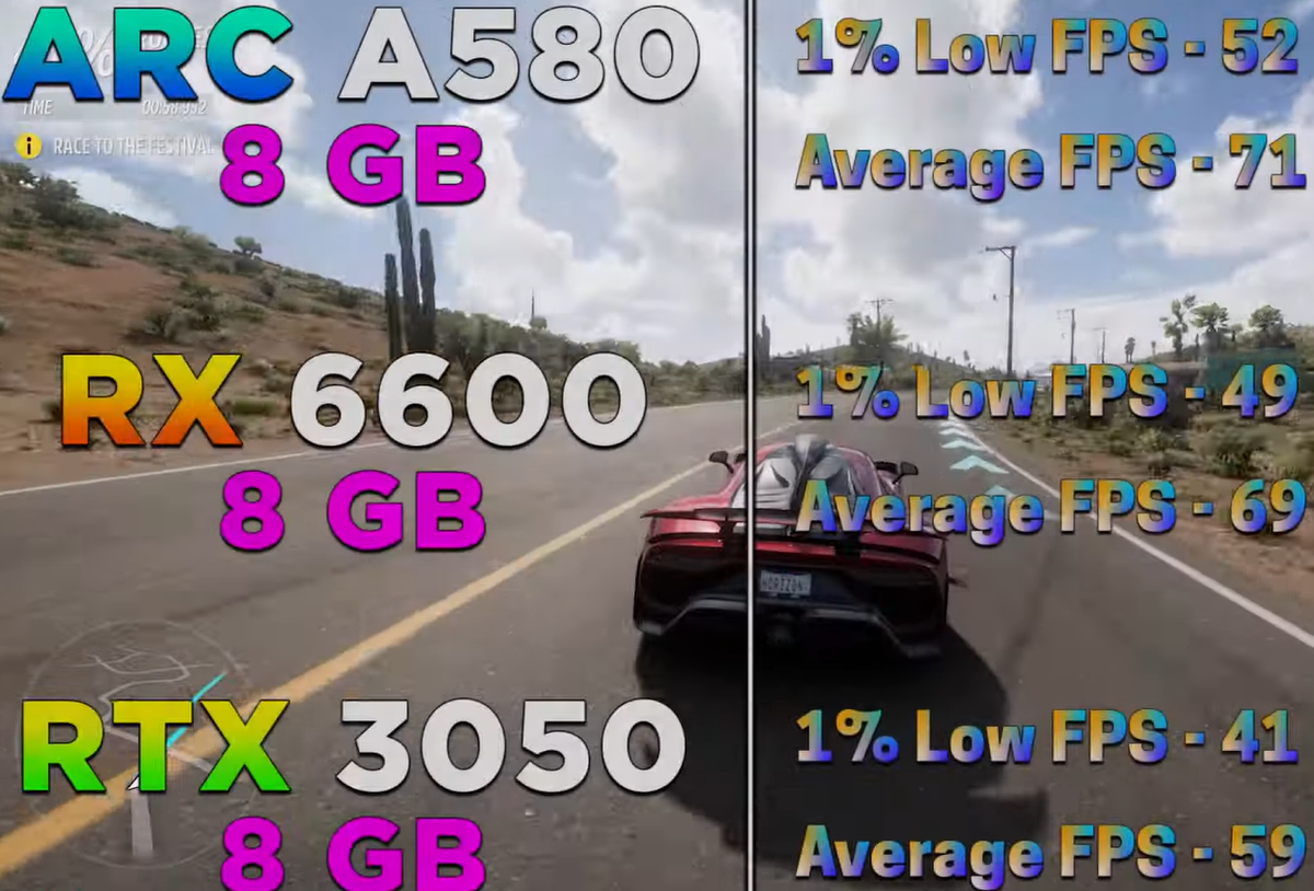 На YouTube-канале TheSpyHood протестировали видеокарты RTX 3050, Intel A580, AMD RX 6600 в играх в 1080p и 1440p на ультра-настройках графики. Call of Duty Modern Warfare III в 1080p шла с 72 к/с (Arc A580), 76 к/с (RX 6600) и 65 к/с (RTX 3050) в среднем, в 1440p - с 58, 59, 47 к/с соответственно. Spider-Man запускалась в 1080p со средней частотой кадров 114 к/с (Intel), 109 к/с (AMD RX 6600) и 96 к/с (RTX 3050), в разрешении 1440p - с 84, 76 и 67 к/с соответственно. Resident Evil 4 тестировалась в разрешении Full HD со средним FPS 76 (Arc A580), 81 (RX 6600) и 65 (RTX 3050), в разрешении 1440p - с 53, 55 и 47 к/с соответственно. Игра The Last of Us шла в разрешении 1080p со средней частотой кадров на уровне 42 к/с (Arc A580), 59 к/с (RX 6600) и 48 к/с (RTX 3050), в 1440p - с 25, 36 и 29 к/с соответственно. Call of Duty Modern Warfare II запускалась в 1080p со средней производительностью в районе 67 к/с (Arc A580), 83 к/с (RX 6600) и 75 к/с (RTX 3050), в разрешении 1440p удалось получи